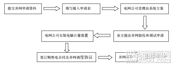分布式項目業主在準備好相關資料后向電網公司地市或縣客戶報務中心提交接入申請,客戶服務中心協助項目業主填寫接入申請表,接入申請受理后在電網公司承諾的時限內,客戶服務中心將通知項目業主確認接入系統方案,項目建成后業主向客戶服務中心提出并網驗收和調試申請,電網企業將完成電能計量裝置安裝,購售電合同及調度協議簽訂,并網驗收及調試工作,之后項目即可并網發電。