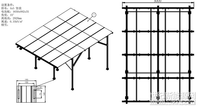 考慮到當天氣候水文條件、以及現場的安裝條件,采用類似陽光房的方案將組件抬高,5*4為一個單元,每個單元內組件串聯接入逆變器,組件排布及支架方案如下: