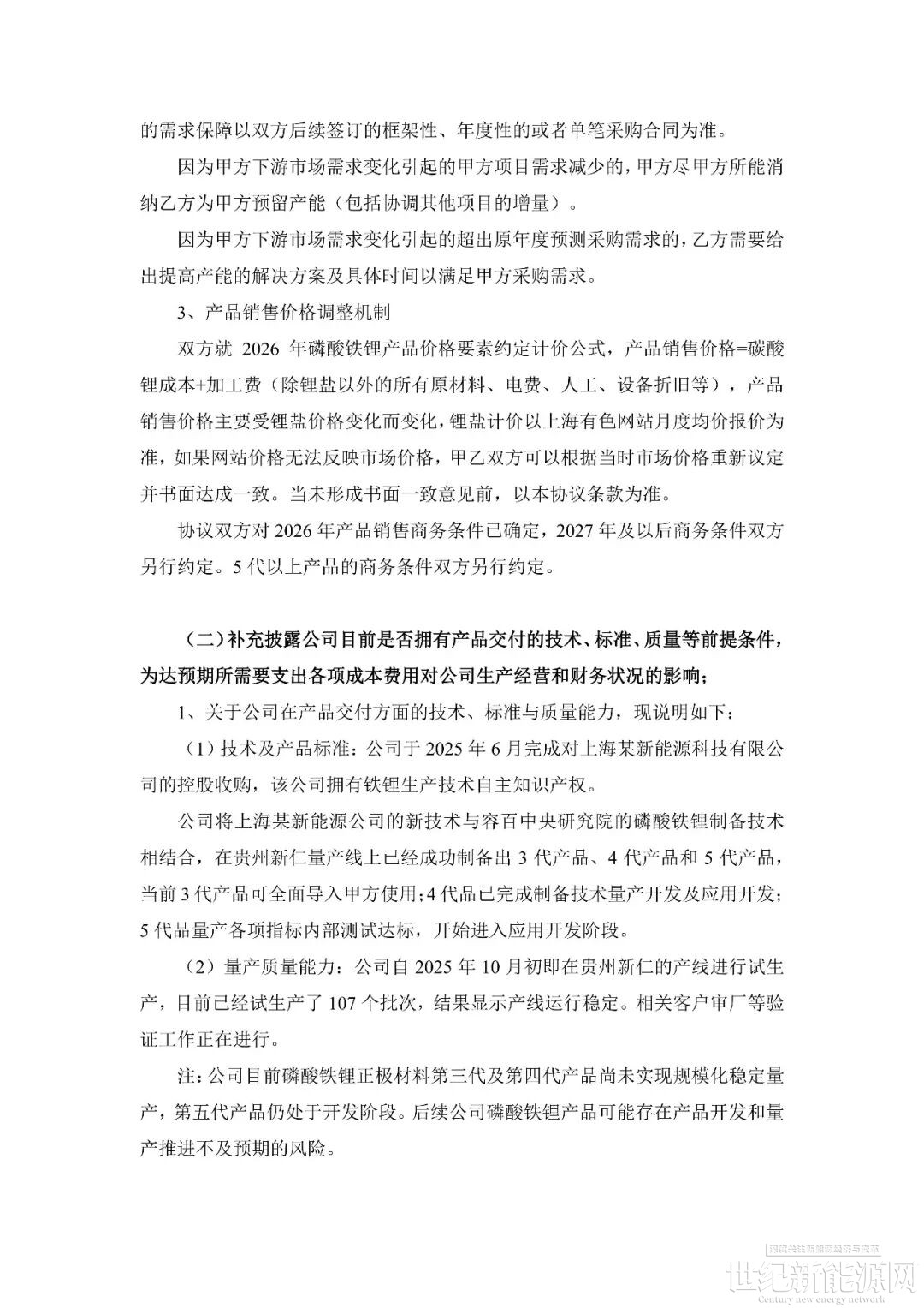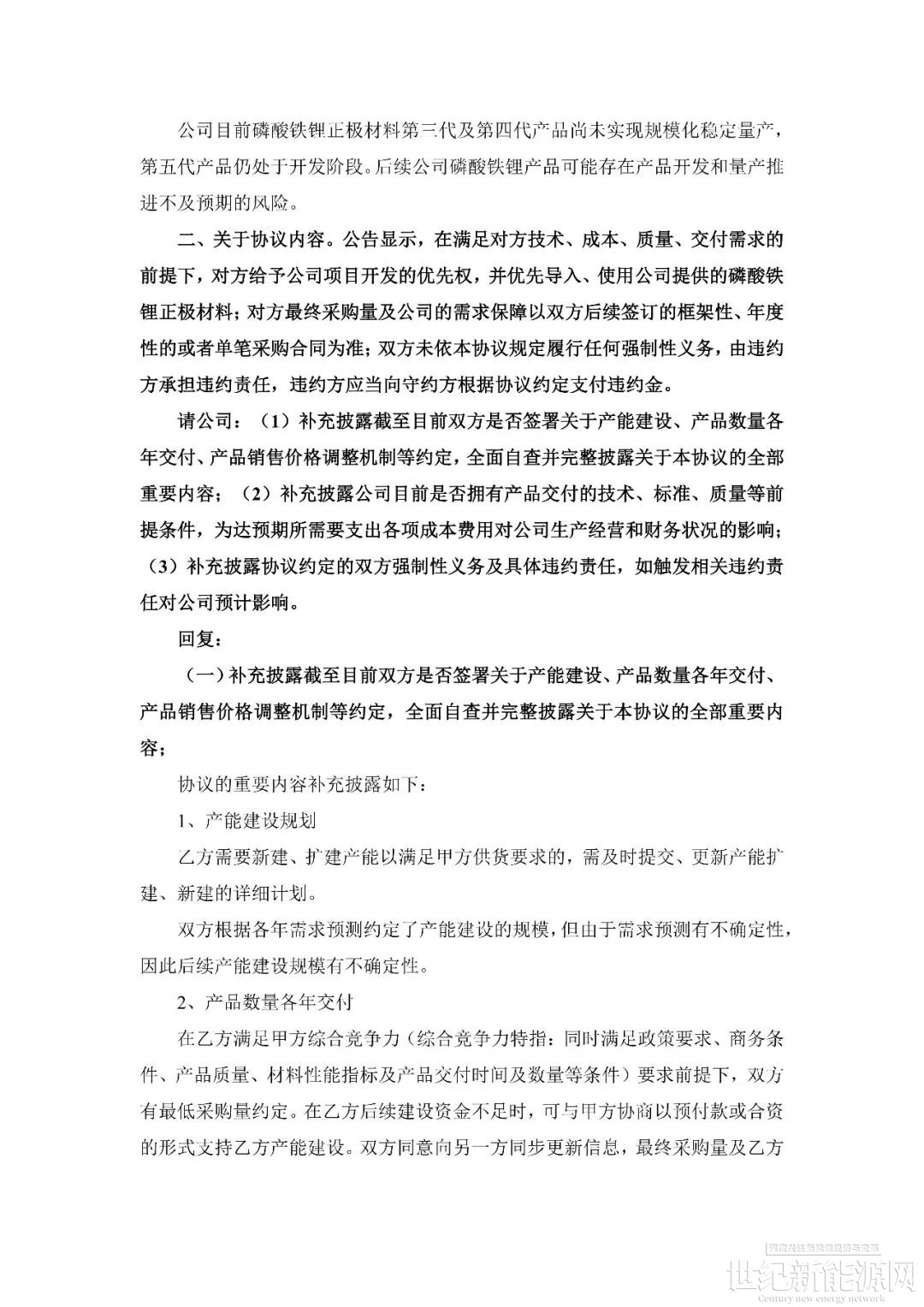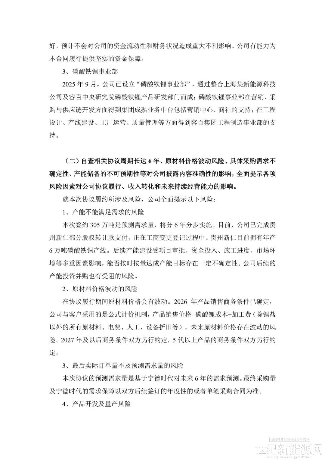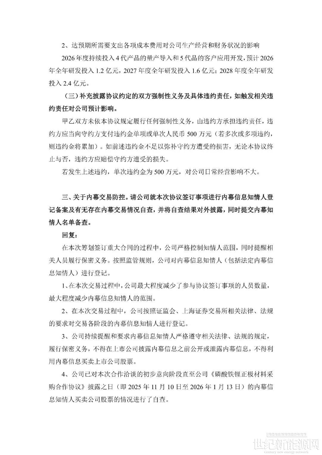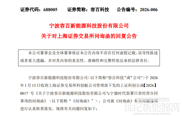回顧事件發生過程。1月14日,容百科技公告披露,自2026年第一季度開始至2031年,將為寧德時代供應國內區域磷酸鐵鋰正極材料預計為305萬噸,協議總銷售金額超1200億元。公告當日,上交所火速下發問詢函,要求公司就信息披露準確性、協議具體內容、內幕信息管控等方面進行補充說明。