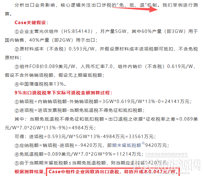 根據中信建投期貨研究發展部分析師假定情況測算,對于一家月產量5GW,40%產量用于出口的企業來說,組件企業取消出口退稅,將抬升成本0.047元/W。