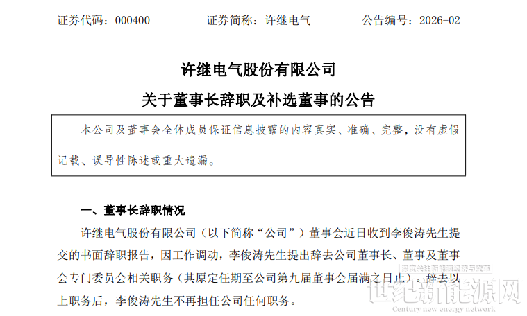 1月20日,許繼電氣董事會收到董事長李俊濤提交的書面辭職報告。因工作調動,李俊濤辭去公司董事長、董事及董事會專門委員會相關職務,辭職后不再擔任公司任何職務。