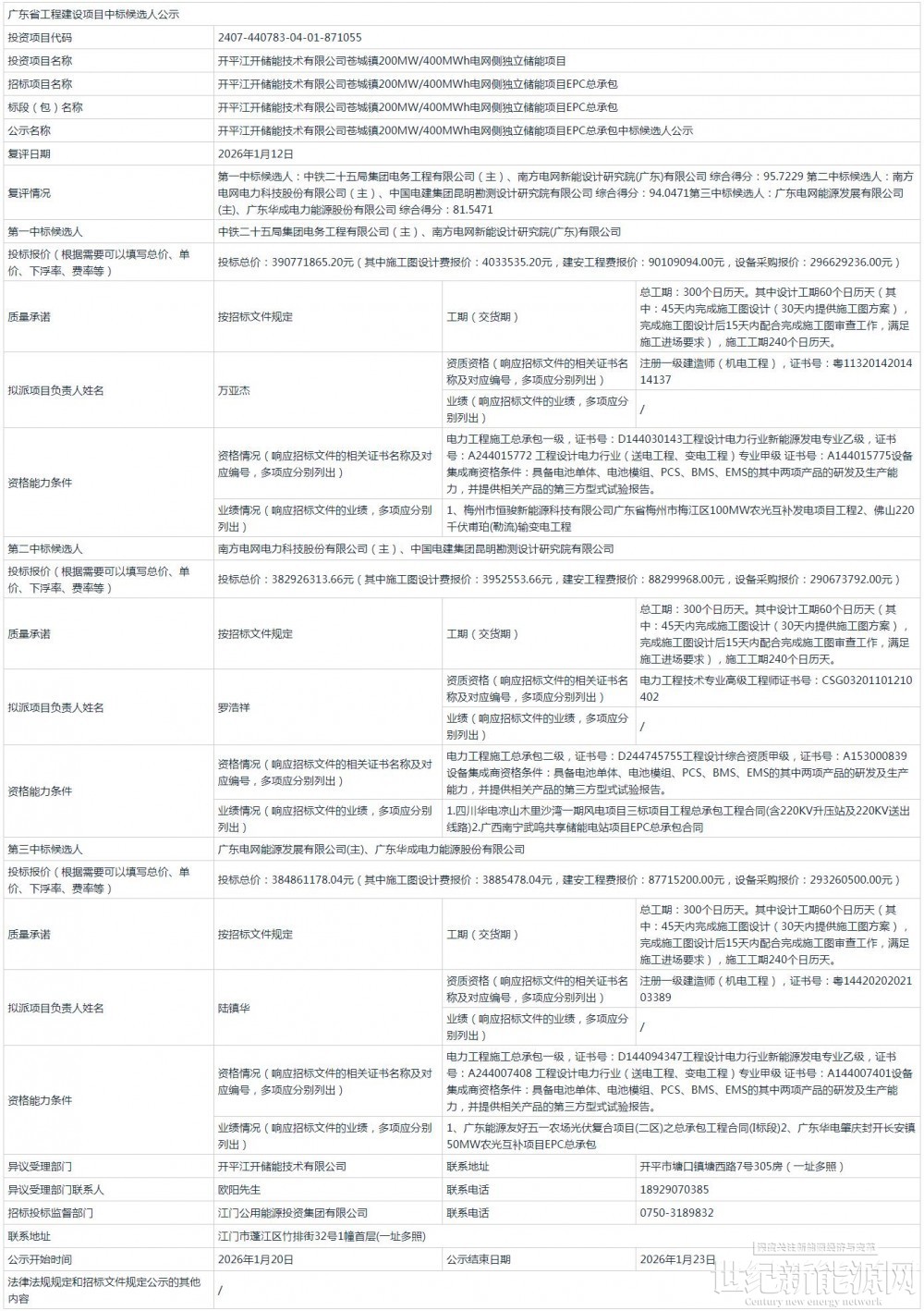 第一中標(biāo)候選人為中鐵二十五局集團(tuán)電務(wù)工程有限公司、南方電網(wǎng)新能設(shè)計(jì)研究院(廣東)有限公司聯(lián)合體,投標(biāo)總價為390771865.20元,折合單價0.977元/Wh;