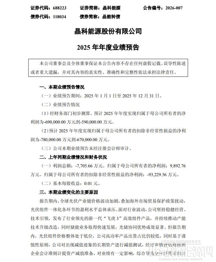 1月21日晚間,晶科能源發(fā)布2025年年度業(yè)績預告。