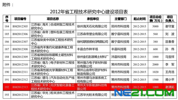 至今,公司在光伏產品智能化生產裝備、檢測設備的研發過程中,獲得完全自主知識產權的授權實用新型32件,受理發明專利17件,受理實用新型專利16件,喜獲2012年江蘇省光伏智能化裝備工程技術中心的立項,標志著天華新能源在技術研發和技術服務方面登上了新臺階。