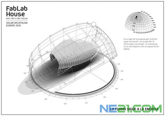 這是西班牙加泰羅尼亞高級建筑學院(IAAC)參加2010世界“太陽能十項全能競賽”并獲得最佳觀眾獎的作品 FABLAB太陽能小屋采用以輕質木材為主要結構部件,數天即可搭建完成,頂部的太陽能光電板為小屋提供所需能源。其造型扭曲如果核、魚肚子,但其拋物線狀的形式,是采集氣候資料后建模成形的,其目的是找到一個最佳朝向來滿足全球不同城市夏季的需要。