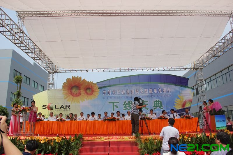 世紀新能源網記者孫文艷現場報道,5月9日10:08分,湖南共創光伏科技有限公司舉行盛大開工投產儀式,伴隨著第一塊高效硅基薄膜太陽能電池成功下線,標志著共創光伏一期50MW項目正式量產。該項目總投資超過20億元,建設年產200MW硅基薄膜太陽能電池模組生產基地,其中首期建設規模50MW,全套引進瑞士歐瑞康最新量產的微晶硅疊層薄膜太陽能電池生產線,光電轉化率達到10%以上,居于全球同類產品領先地位。